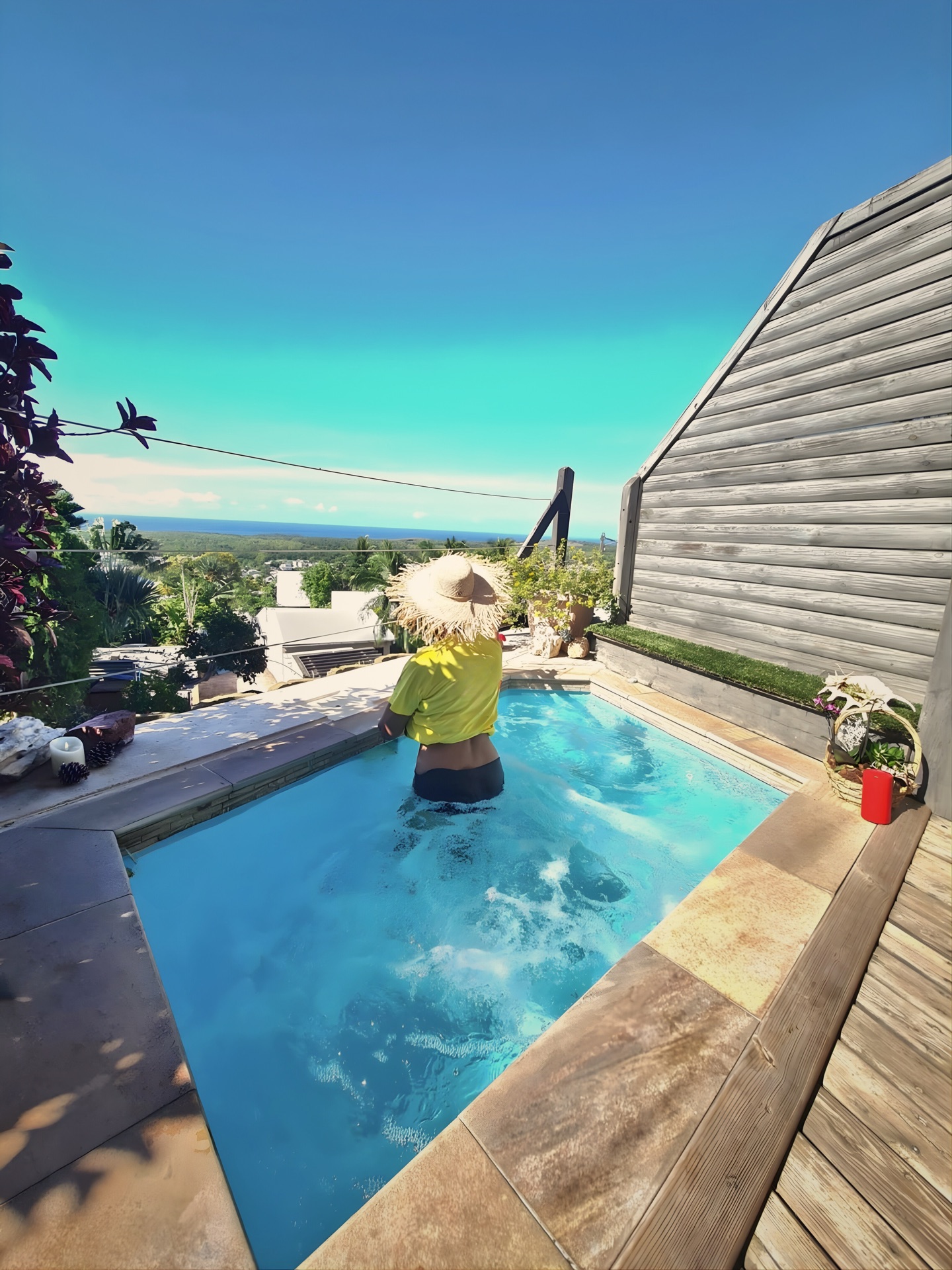 Jacuzzi chauffé sur la terrasse avec vue mer et coucher de soleil